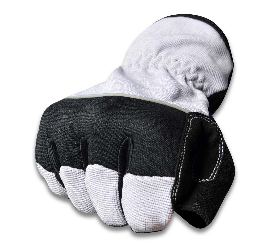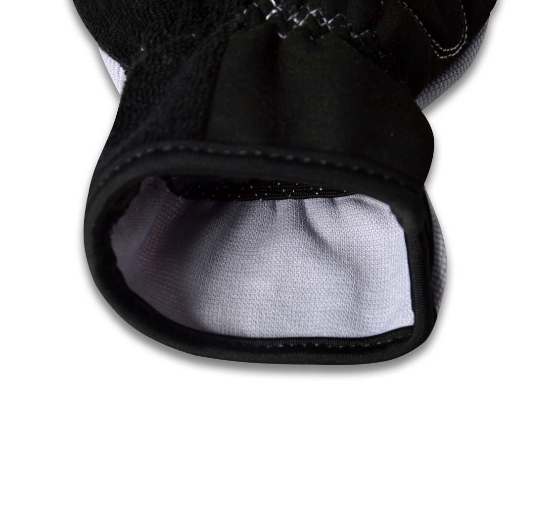 Cycling Glove Cut Finger. Palm Side Synthetic Leather with Reinforcement and inside Foam padding. Back side Fourway, neoprene towel on thumb. Elastic on wrist. Pullers on fingers. Hook and Loop closure.