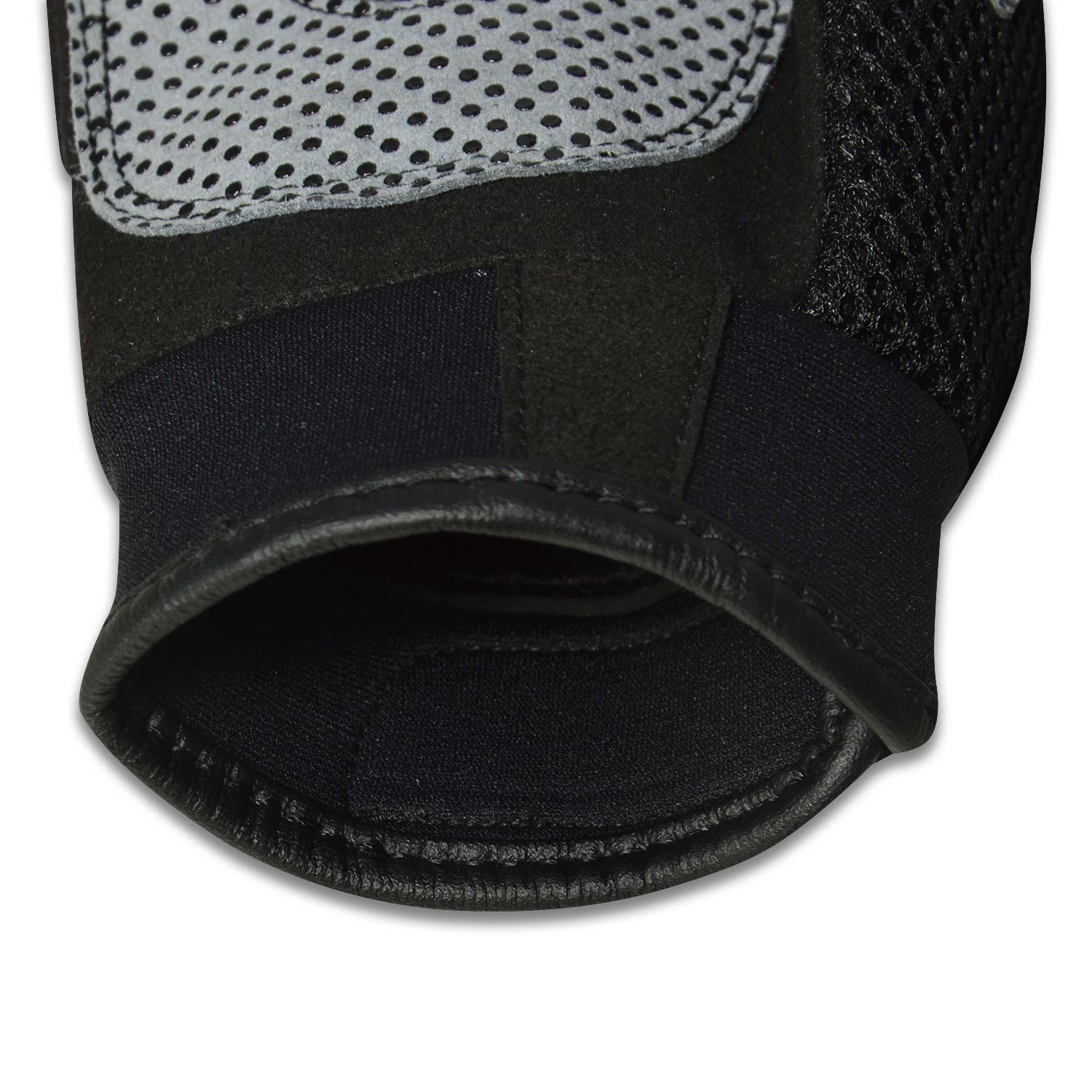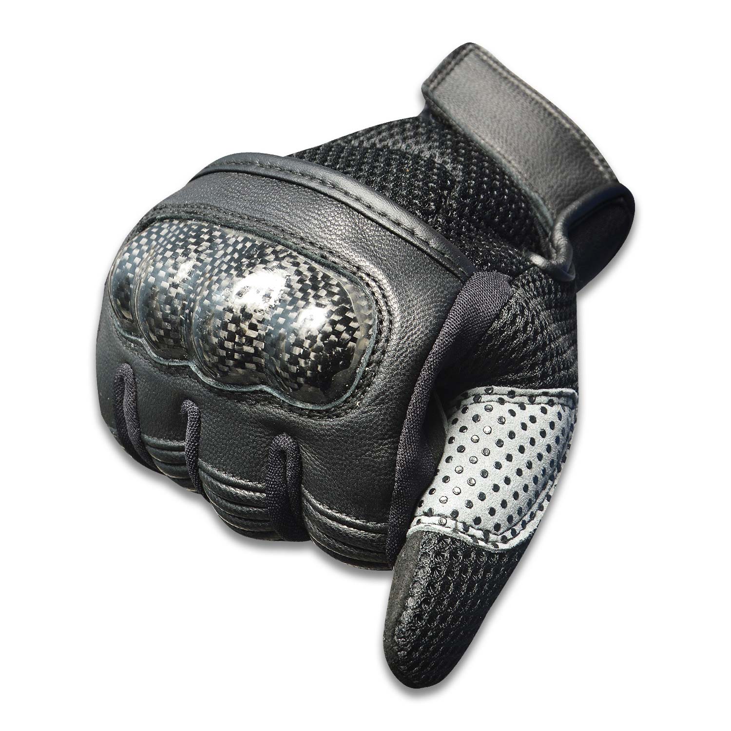 Back Side Mesh fabric and goat skin leather with Kevlar hard knuckle. Rubber padding on back of fingers and below the Knuckle.