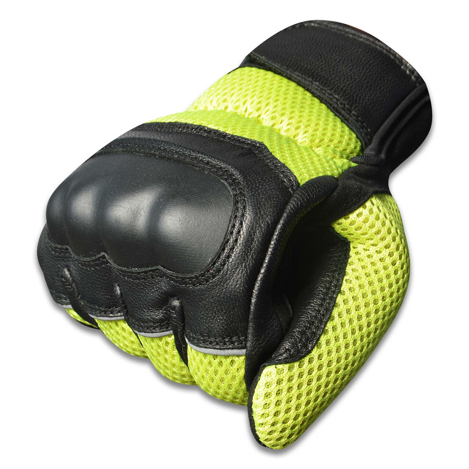 Back Side Mesh fabric (Florescent) and goat skin leather with PLASTIC hard knuckle. Mesh on Thumb. Reflector tape.