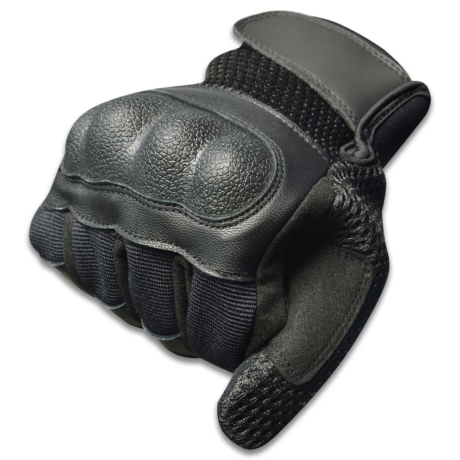 Back Side Fourway, Mesh fabric and goat skin leather with PLASTIC hard knuckle. Rubber padding on back of fingers.